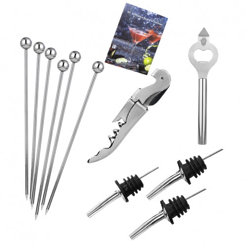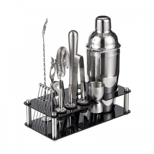 | Комплектація | Подставка, шейкер, щипцы, стрейнер, мадлер, джиггер, ложка спираль, гейзер 3шт., открывалка, штопор, книга рецептов коктелей на английском, коктельные |