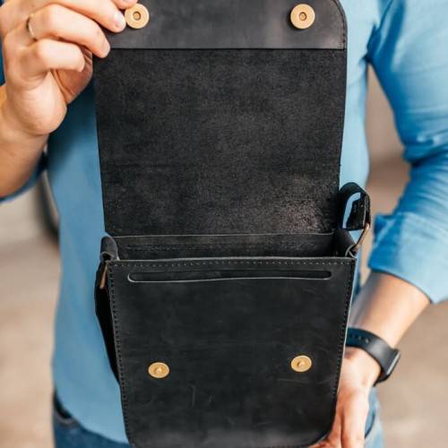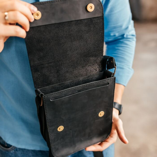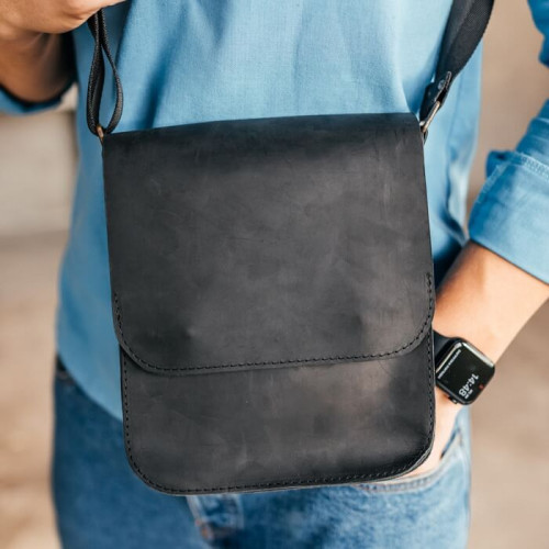 Ця чорна сумка може замінити вам клатч або барсетку, створюючи вишуканий образ. Вона має зручний ремінець для перенесення через плече, що додає комфорту під час її використання. Завдяки своєму дизайну і функціональності, ця шкіряна сумка-месенджер стане незамінним аксесуаром для вашого повсякденного життя.