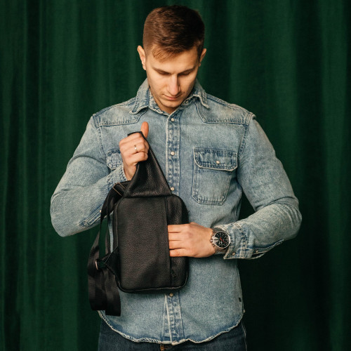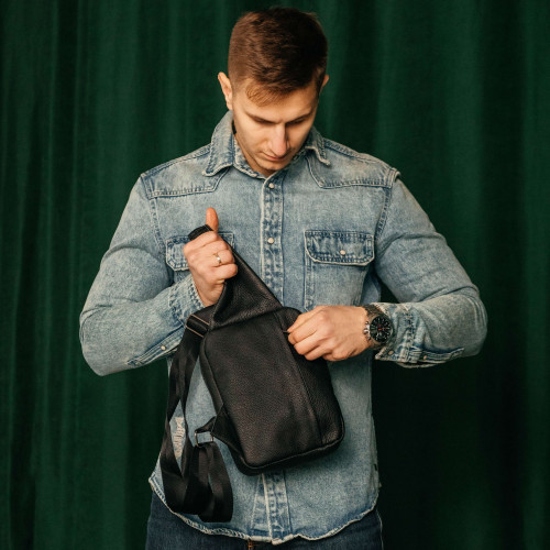 Чоловіча шкіряна чорна сумка через плече слінг Boston