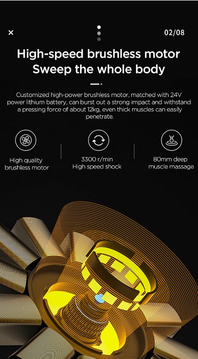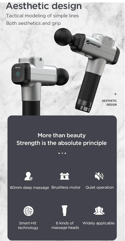 Технологія безщіткового двигуна 24 В забезпечує більш стабільний та комфортний досвід використання Booster A 2 . Висока частота вібрацій сприяє розсіюванню втоми , глибокого масажу , розслабленню м'язів , полегшення болю . Відрегулюйте частоти відповідно до мети : для розігріву , полегшення болю , лікування пошкоджених м'язів , м'язовий біль та активації м'язів ; збільшіть на вищу швидкість для великих та сильних груп м'язів .
