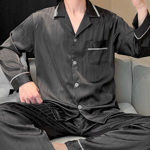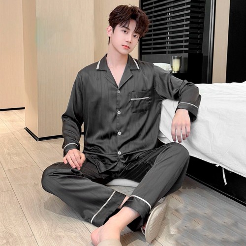 Шелковый комплект мужской пижамы TX0030 Черный рубашка с длинным рукавом и штанами атласная 3XL