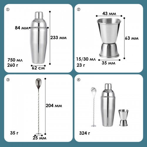 | Состав набора | Шейкер с ситомв крышке (750 мл), джиггер двусторонний (15/30 мл), ложка спиральная. |