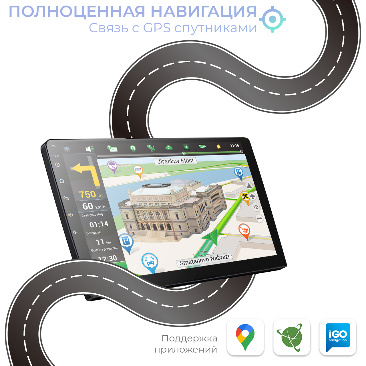 Одним из главных достоинств головного устройства является поддержка GPS навигации. Данная модель, в отличии от аналогов, для улучшения связи использует выносную антенну, которую вы можете закрепить так, как вам удобно. Антенна гарантирует более стабильную связь и определение спутников в самых отдалённых уголках страны. Благодаря системе андроид, вы можете подобрать навигационное приложение под свои нужды, загрузив его с Play Market, в качестве стандартного навигационного ПО производителем было установлено приложение Google Maps.