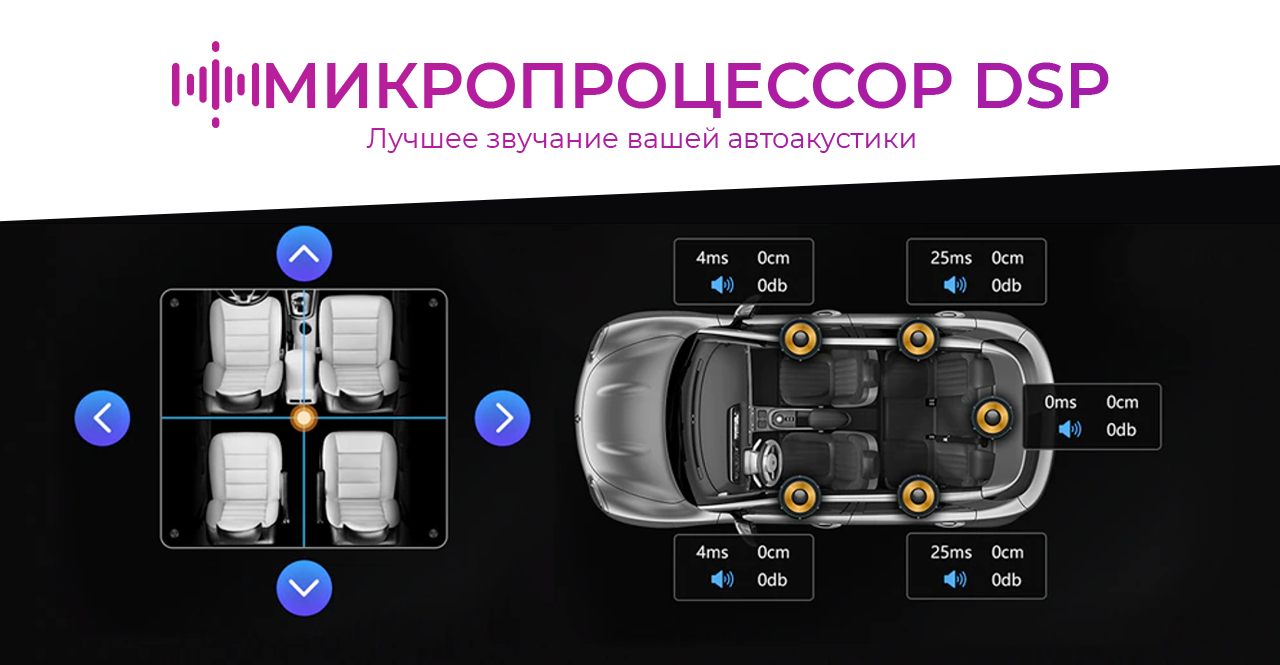 С целью обеспечения наиболее качественного звучания на материнской плате предустановлен специализированный микропроцессор, так называемый DSP, который используется для обработки цифрового сигнала в режиме реального времени. Принцип работы технологии заключается в подстройке параметров составляющих автоакустики согласно АЧХ салона вашего автомобиля. Если выражаться проще, по умолчанию, все компоненты акустической системы работают в штатном режиме, выдавая частотный диапазон и мощность примерно на одном уровне, в свою очередь, DSP процессор подстраивает параметры системы в записимости от АЧХ, расположения компонентов и водителя в салоне авто. Данная настройка значительно улучшает звучание любой композиции, раскрывая её по новому.
