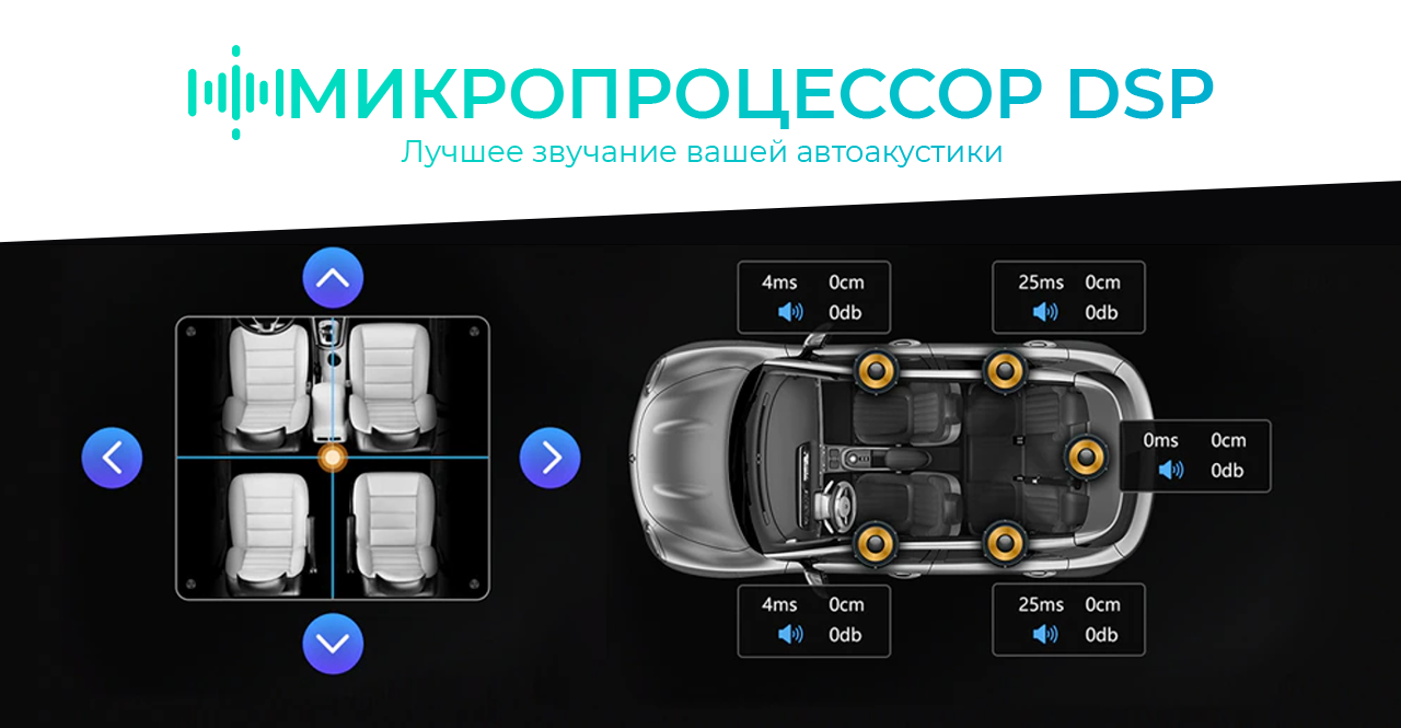 С целью обеспечения наиболее качественного звучания на материнской плате предустановлен специализированный микропроцессор, так называемый DSP, который используется для обработки цифрового сигнала в режиме реального времени. Принцип работы технологии заключается в подстройке параметров составляющих автоакустики согласно АЧХ салона вашего автомобиля. Если выражаться проще, по умолчанию, все компоненты акустической системы работают в штатном режиме, выдавая частотный диапазон и мощность примерно на одном уровне, в свою очередь, DSP процессор подстраивает параметры системы в записимости от АЧХ, расположения компонентов и водителя в салоне авто. Данная настройка значительно улучшает звучание любой композиции, раскрывая её по новому.