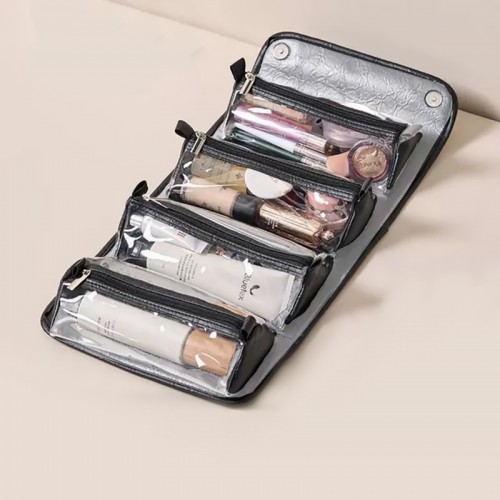 Косметичка имеет 4 съемные прозрачные секции на молниях, которые легко достаются или переставляются. Это позволяет быстро найти нужную вещь и поддерживать порядок. В сложенном виде косметичка выглядит как стильная сумочка с ручками, удобная для переноски.