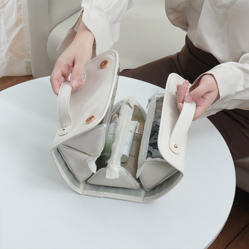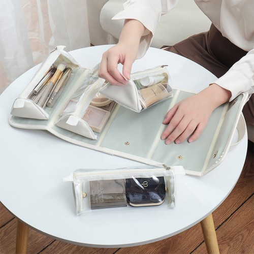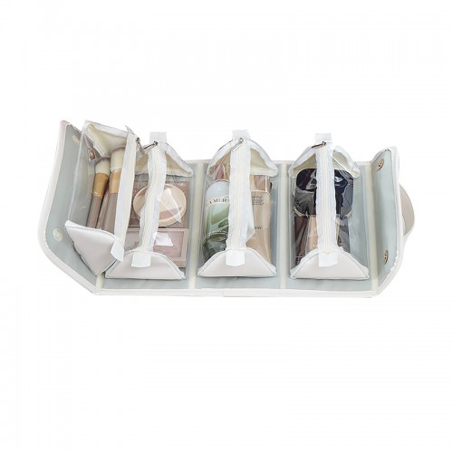 Косметичка имеет 4 съемные прозрачные секции на молниях, которые легко достаются или переставляются. Это позволяет быстро найти нужную вещь и поддерживать порядок. В сложенном виде косметичка выглядит как стильная сумочка с ручками, удобная для переноски.