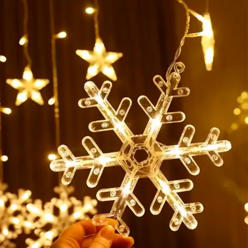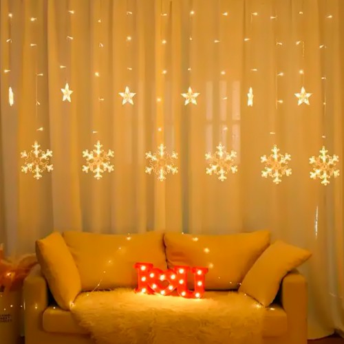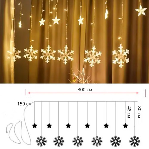 Новогодняя светодиодная гирлянда штора 3*1 метр Снежинка и звезда Теплый свет