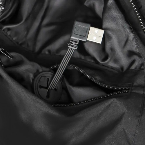 -Подогрев куртки работает от удобного и переносного повербанка через провод USB, что позволяет быть мобильным и независимым от электросети.
