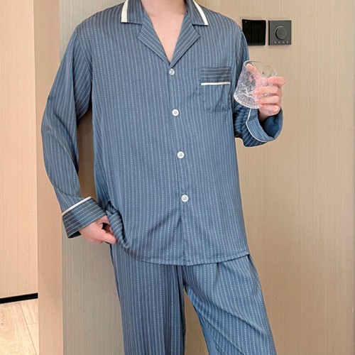 Шелковый комплект мужской пижамы TX0031 Синий рубашка с длинным рукавом и штанами атласная XL