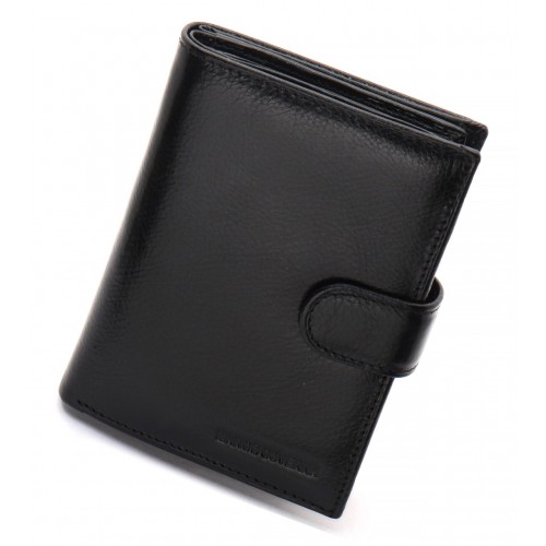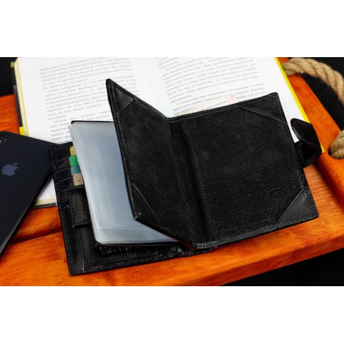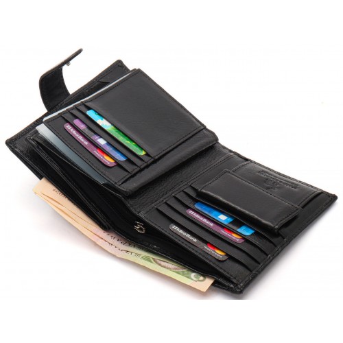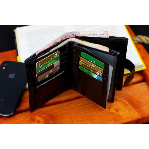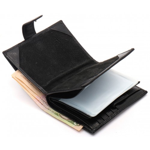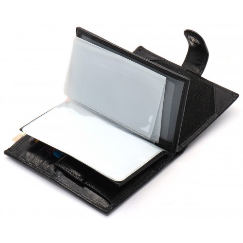 Чоловіче портмоне у вигляді книжечки виконане у класичному стилі. У ньому є не лише 3 відділення для купюр, а й об'ємний блок для документів, де можна розмістити права водія і техпаспорт на автомобіль. Прилеглі кишені можна використовувати для зберігання грошей на "чорний день". У шкіряному гаманці також є місце для восьми банківських карток та відділення для паспорта. Монети зручно носити у кишені на кнопці.