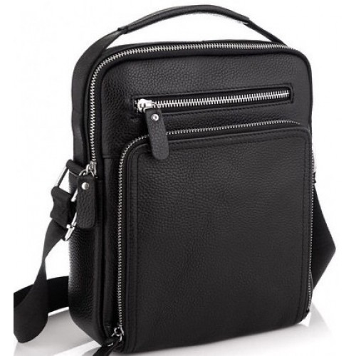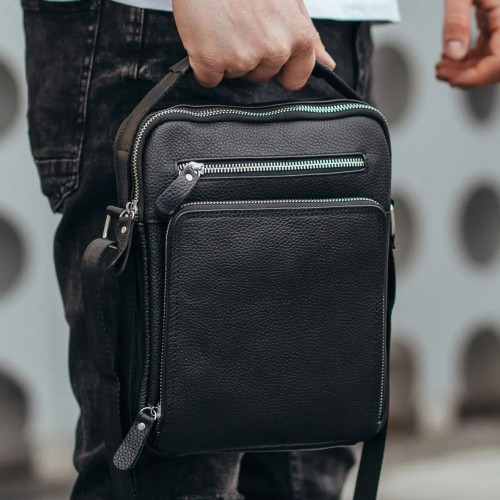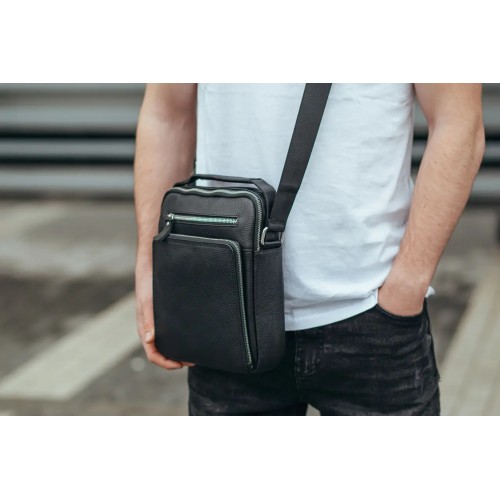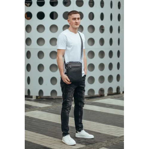 Чоловічий месенджер Tiding Bag виготовлений з натуральної телячої шкіри. Аристократичний чорний колір підкреслює статусність власника. Лаконічний дизайн дозволяє використовувати аксесуар із повсякденним та діловим одягом. Для носіння можна використовувати коротку ручку або плечовий ремінь, регульований по довжині. На сумку встановлено надійну металеву фурнітуру.