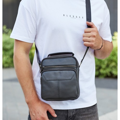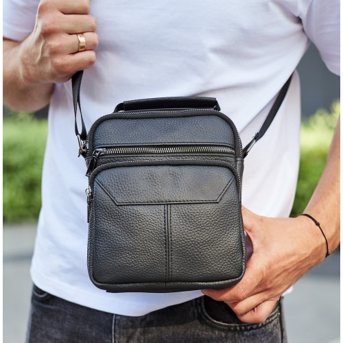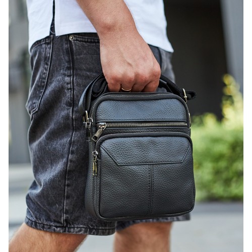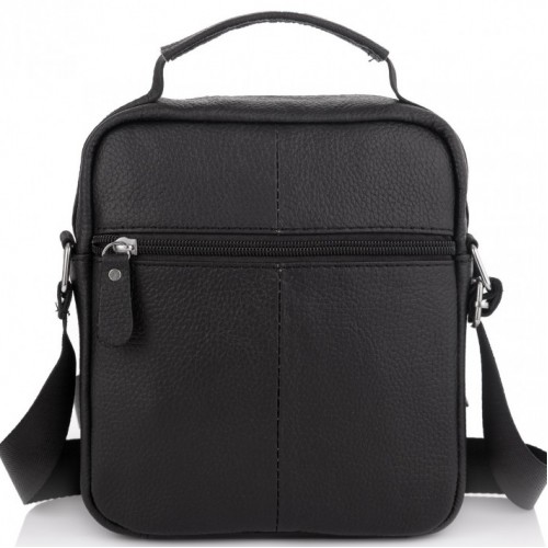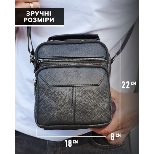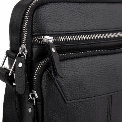 Шкіряний чоловічий месенджер виконаний з м'якої натуральної шкіри чорного кольору. Ця модель має одне основне відділення, що закривається на блискавку, і всередині якого розміщена бічна кишеня на блискавці. Ззовні з тильного боку сумки розміщена кишеня на блискавці, а з лицьової частини - дві кишені одна над одною на блискавці: накладна та врізна. Плечовий ремінь регулюється. Підкладка міцна – текстиль.