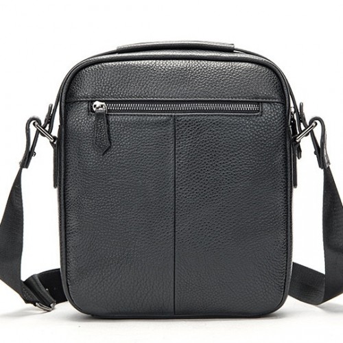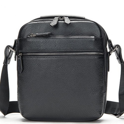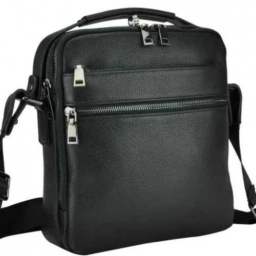 Сумка на плече з натуральної шкіри з зернистою матовою поверхнею. Основне відділення розташування в собі горизонтальний відсік відкритого типу і кишеню на блискавці. Ремінь на плече є вшитим, виконаний з щільного текстилю і регулюється по висоті. З лицьової частини дві кишені на блискавках, з тильної сторони один кишеню. Фурнітура сріблястого кольору. Модель є каркасною і відмінно тримає форму.