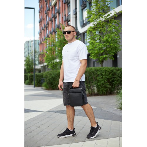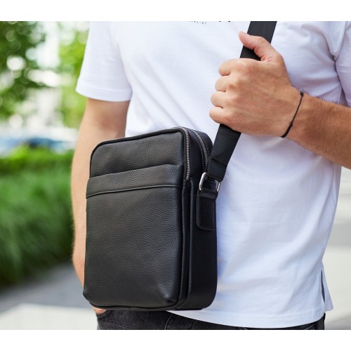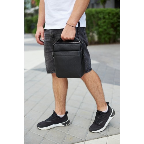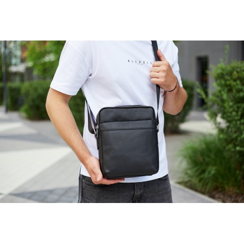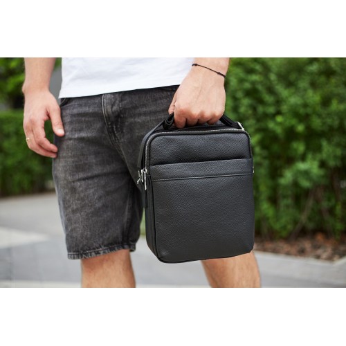 Чудова чоловіча сумка вертикального формату, виготовлена з натуральної шкіри чорного кольору. Вона відмінно доповнить як діловий, так і повсякденний стиль і стане Вашим улюбленим аксесуаром, завдяки своїй практичності. Чоловіча сумка через плече чорного кольору. У сумки є два основних відділення, всередині яких є маленька кишеня на замку і кишеня відкритого типу, а також з лицьової і тильної сторони є дві кишені на замку.