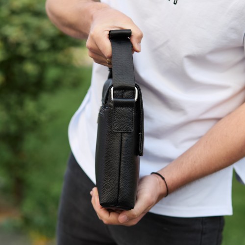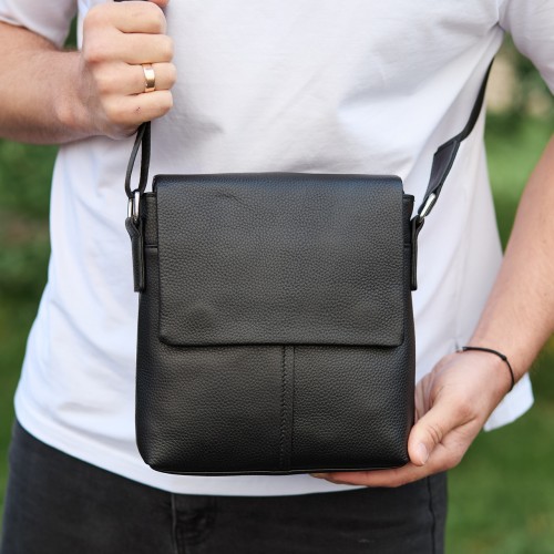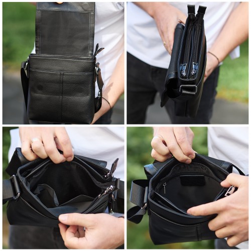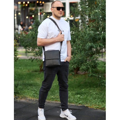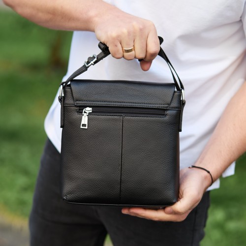 Чоловіча шкіряна сумка через плече (месенджер) є дуже потрібним і практичним аксесуаром для сучасного чоловіка. Ця сумка має стильний вигляд, якісно зроблена та гармонійно підійде до будь-якого стилю, а завдяки своїй формі зручна у використанні. Сумка закривається на перекидний клапан, під яким розміщено два основні відділення, що закриваються на змійці. Усередині сумки додатково є бічна кишеня на блискавці та дві відкриті кишені для дрібниць. Зовні під клапаном розміщена глибока відкрита кишеня, а з тильного боку — врізна кишеня на блискавці. Підкладка сумки — текстиль. Колір фурнітури — срібло. Має текстильний регульований ремінь.
