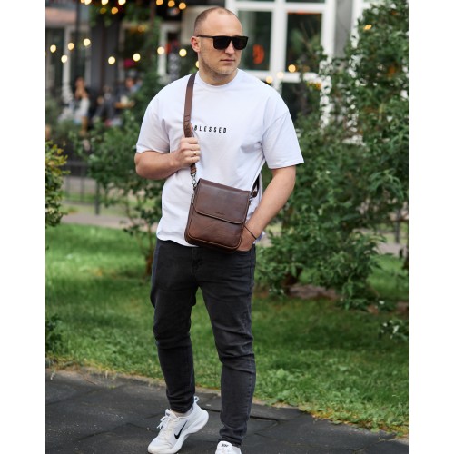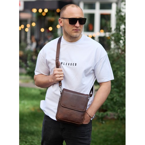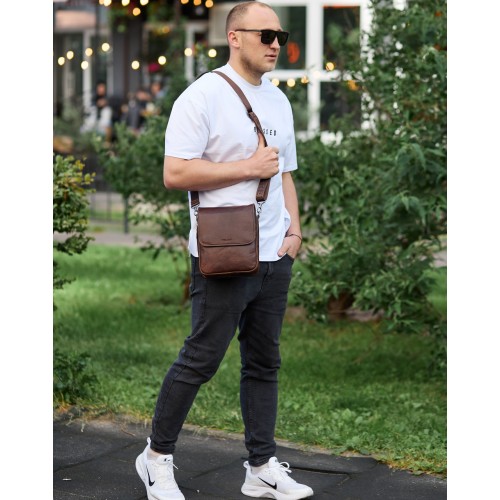 Доволі вмістовна чоловіча сумка через плече, виконана з м'якої високоякісної натуральної шкіри. Два основних відділення рівномірні, одне з них має бокову кишеню на блискавці, а також кишеню відкритого типу. Між основними відділеннями є додаткове відділення на магнітній кнопці. З тильної частини сумки знаходиться кишеня на блискавці, а з лицьової частини – глибоке відділення без застібки під накидкою. Відділення застібаються за допомогою якісної фурнітури. Внутрішнє оздоблення сумки - щільна підкладка. Ремінь сумки текстильний, знімний, надійно кріпиться за допомогою карабіна.