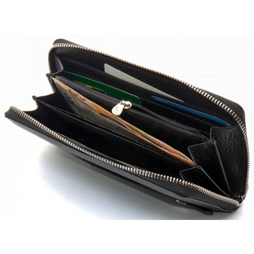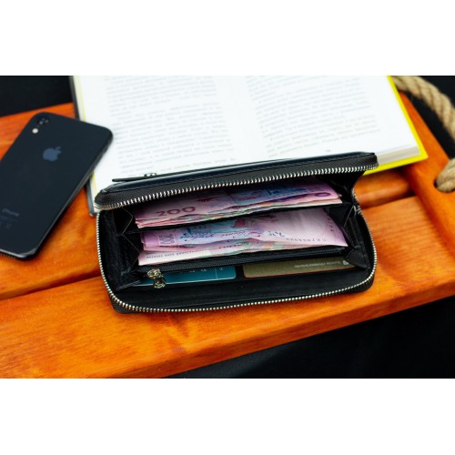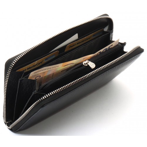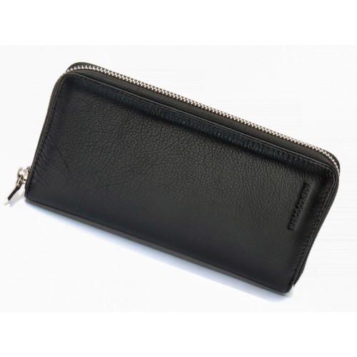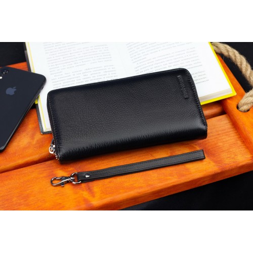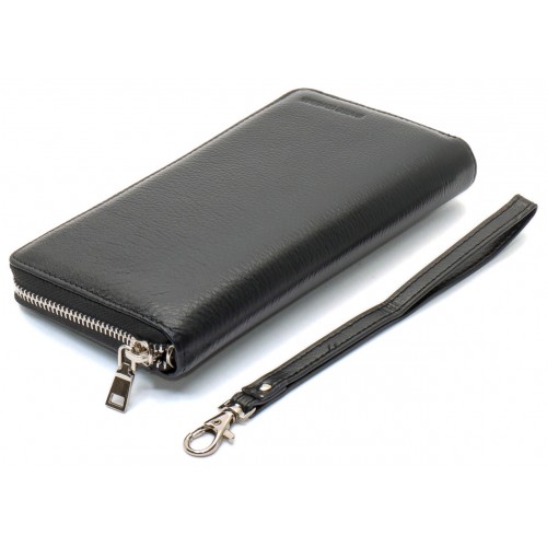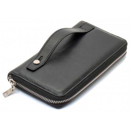 Чоловічий гаманець оснащений ремінцем для тримання його на долоні та ременем на зап'ястя. Це дозволяє використовувати аксесуар як клатч, так і портмоне. Модель відрізняється особливою вмістовністю, оскільки має три відділення для банкнот. Вони розділені двома кишенями-перегородками. При цьому одна із них закривається на блискавку, де можна потім зберігати монети. Кредитки розміщуються всередині по бокам гаманця, що дозволяє їх швидко виймати. Виріб виконаний із натуральної шкіри з фактурною поверхнею, яка ідеально поєднується з металевою блискавкою.