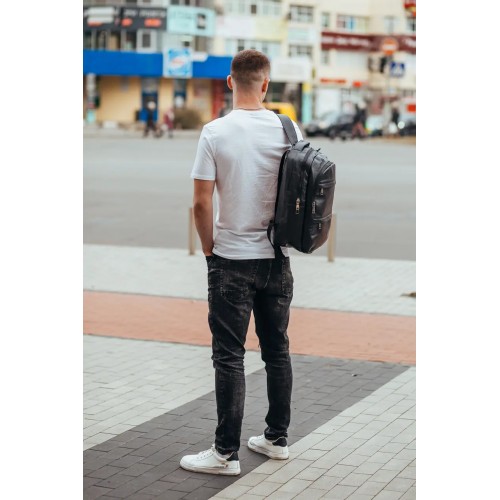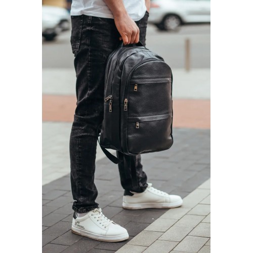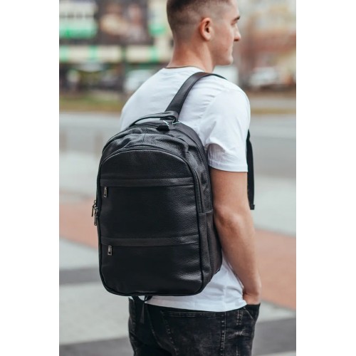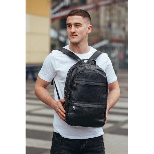 Рюкзак міський з натуральної шкіри має 2 відділення на блискавці, всередині 1 кишеню для , гаманця або інших потрібних речей. Рюкзак вміщує ноутбук. З лицьового боку рюкзака – 2 кишені на блискавці. З тильного боку – 1 горизонтальна кишеня на блискавці. Підкладка – текстиль. Фурнітура – метал. Лямки із натуральної шкіри регулюються по довжині.