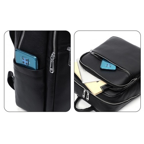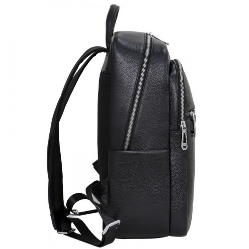 Чоловічий рюкзак від виробника Tiding Bag зроблений із натуральної шкіри чорного кольору. Ця модель вирізняється місткістю, стриманим дизайном і зручністю у використанні. Основне відділення закривається на блискавку з двома бігунками. У нього можна покласти папки з документами, ґаджет. З лицьового боку є велика кишеня на блискавці, де поміститься щоденник та інша канцелярія. Шлейки рюкзака зміцнені додатково текстильними вставками. Для комфорту під час носіння регулюються за довжиною.