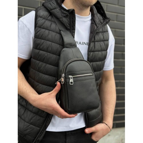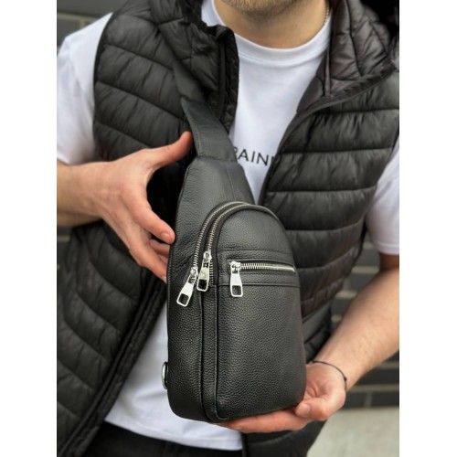 Чоловіча сумка-бананка через плече 18х32х7, рюкзак унісекс на груди з натуральної шкіри TIDING BAG 3280 чорний