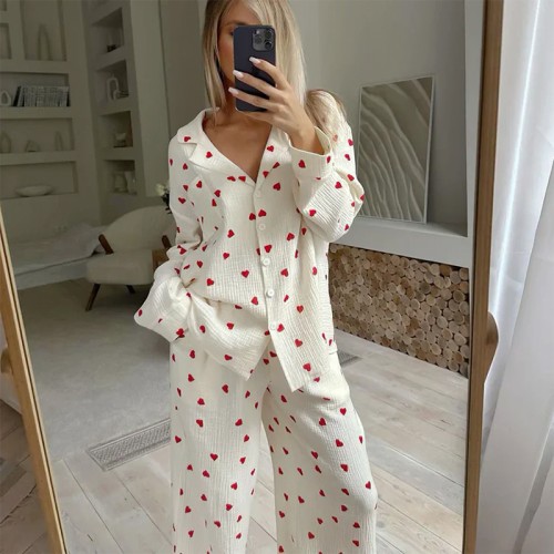 Женский муслиновый костюм 2SYCK1853B1 для дома рубашка с длинным рукавом брюки пижама Кремовый с сердечками L