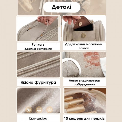 Дополнительные кармашки и отделения идеально подходят для хранения мелких предметов, таких как ватные диски, спонжи, резинки для волос, украшения и т.д.