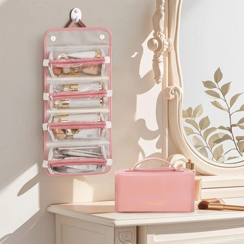 Косметичка имеет 4 съемные прозрачные секции на молниях, которые легко достаются или переставляются. Это позволяет быстро найти нужную вещь и поддерживать порядок. В сложенном виде косметичка выглядит как стильная сумочка с ручками, удобная для переноски.