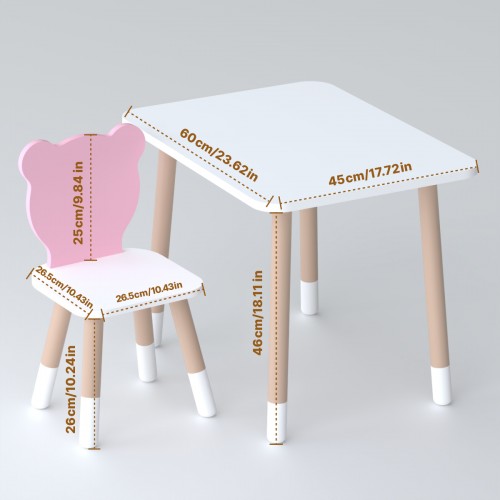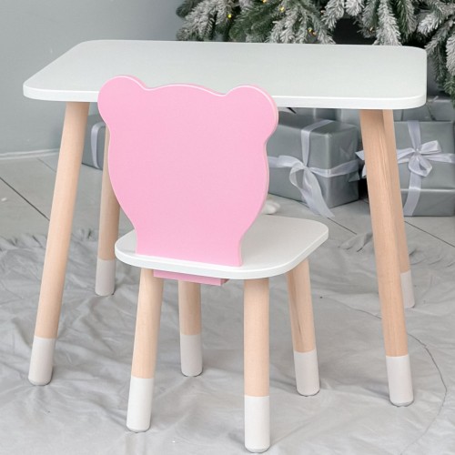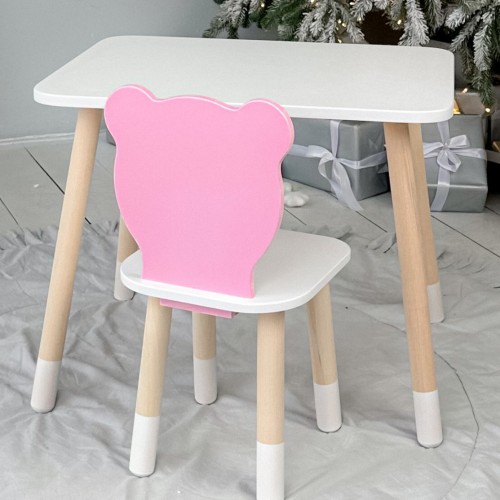 Стіл прямокутний 46х60х45 і стілець медвежа 26.5х26х25, столик та стільчик в дитячу, білий з рожевим