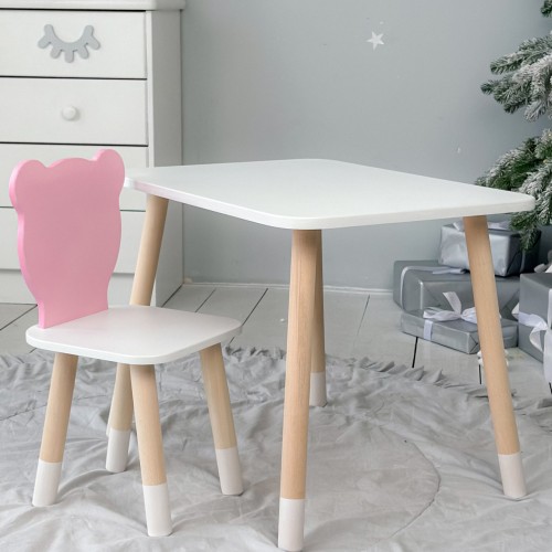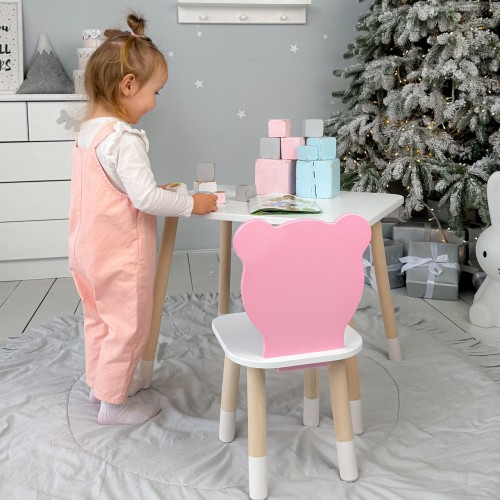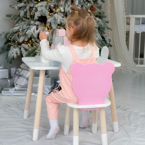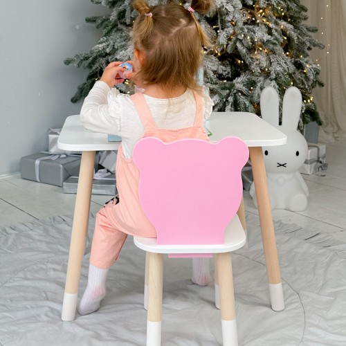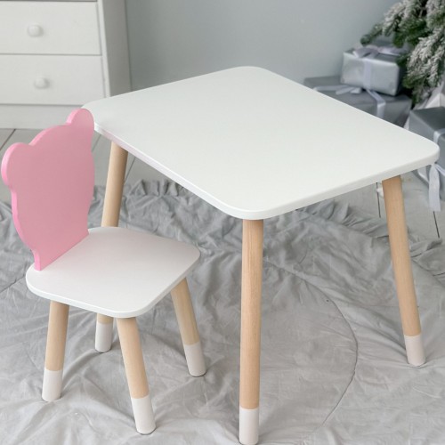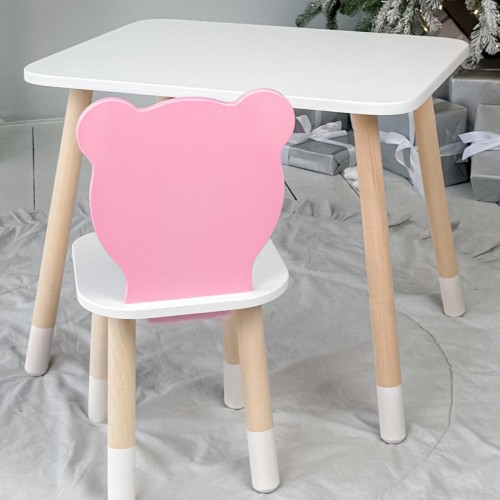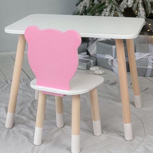 Прямокутний стіл і стільчик рожевий  дитячий ведмежа з білим сидінням. Столик білий дитячий
