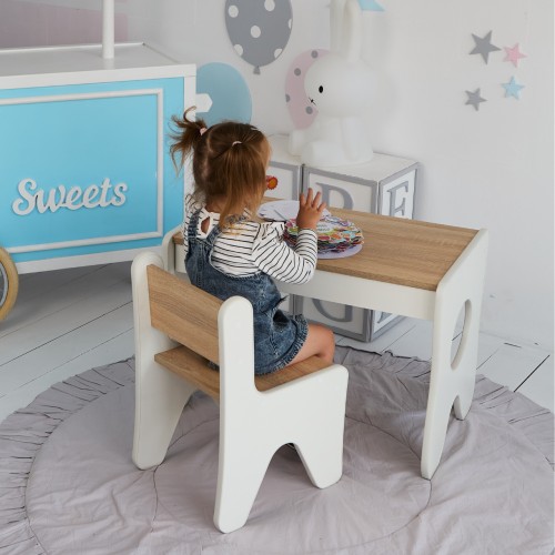 Ви можете зібрати повноцінний комплект столик зі стільчиком в єдиному стилі. Такий набір стане зручним та практичним рішенням для дитячої кімнати, забезпечуючи малюку комфортне місце для занять та ігор.