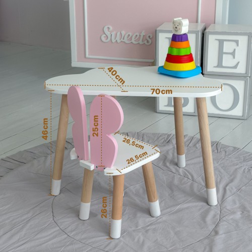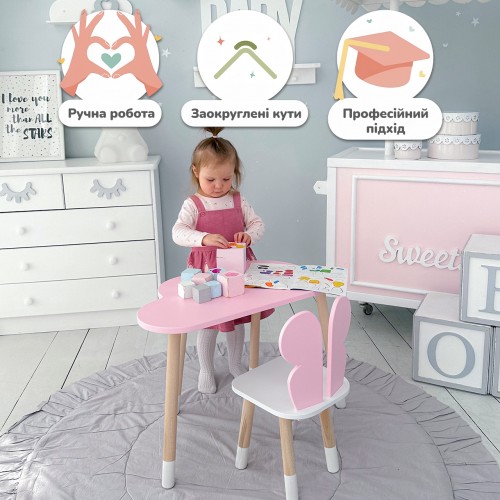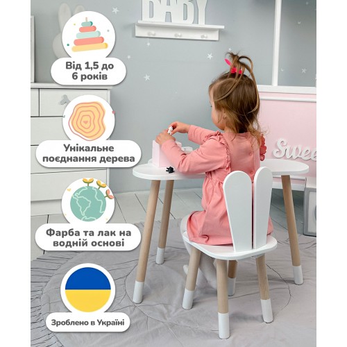 Ви можете зібрати повноцінний комплект – столик зі стільчиком в єдиному стилі. Такий набір стане зручним і практичним рішенням для дитячої кімнати, забезпечуючи малюкові комфортне місце для занять та ігор.