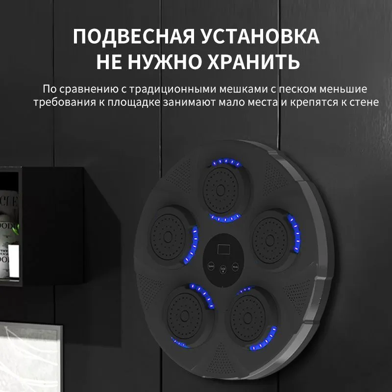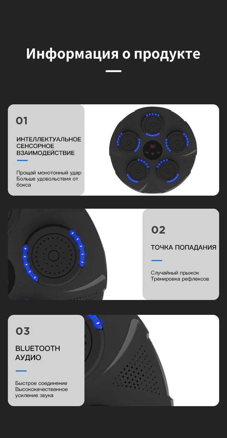 - Реактивна мета: Мультимузична мета для боксу обладнана світловими індикаторами, які спалахують при ударі, вимагаючи точного і швидкого реагування. Це допомагає покращити зорово-моторну координацію, реакцію, швидкість та точність ударів.