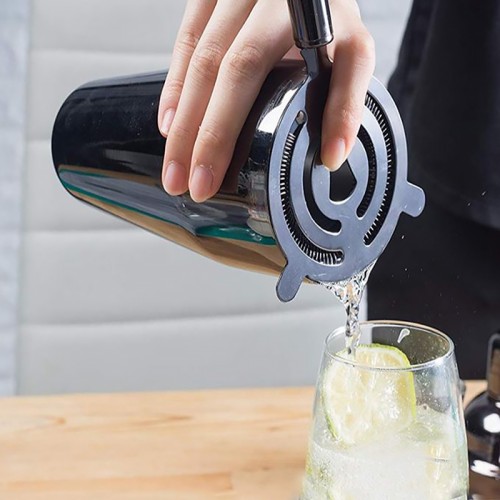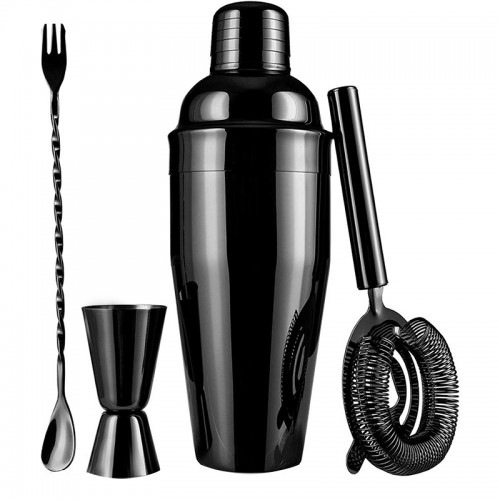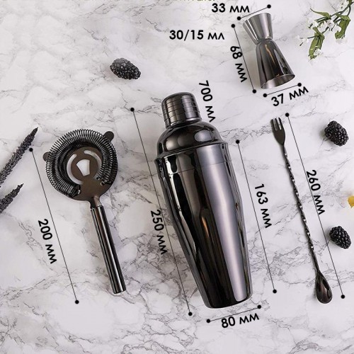 Этот элегантный барный набор из 4 предметов — идеальный вариант для тех, кто хочет почувствовать себя настоящим миксологом прямо дома. В комплект входит всё необходимое для приготовления классических и авторских коктейлей: большой шейкер объёмом 700 мл, измерительный джиггер на 15/30 мл, барная ложка с вилкой и сито для процеживания напитков. Все элементы выполнены из высококачественной нержавеющей стали и покрыты благородным чёрным хромированным покрытием, что придаёт набору премиальный вид.