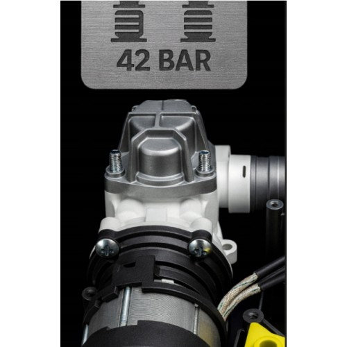Мийка оснащена подвійною високонапірною алюмінієвою помпою боксерного типу, яка забезпечує стабільний тиск до 42 бар. Безщітковий двигун працює тихіше, служить довше та не потребує складного обслуговування.
