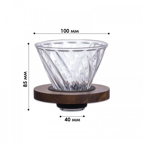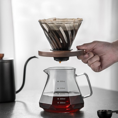 Вид и использование: Пуровер имеет прозрачную стеклянную конструкцию, позволяющую наблюдать за процессом заваривания. Изысканная деревянная подставка придает элегантность и стабильность при использовании. Благодаря эргономичному дизайну, этот пуровер удобен в использовании, а процесс приготовления кофе будет доставлять удовольствие каждый раз.