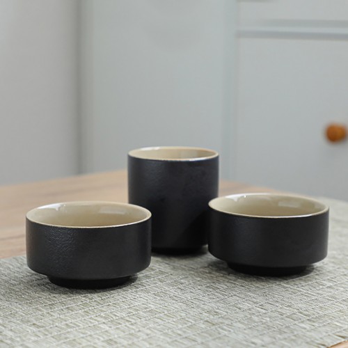 Набор включает пиалы и чашка, которые выполнены в едином стиле - с матовым покрытием снаружи и бежевым покрытием внутри.