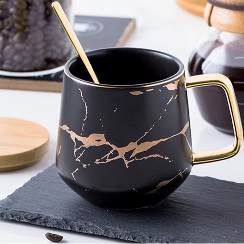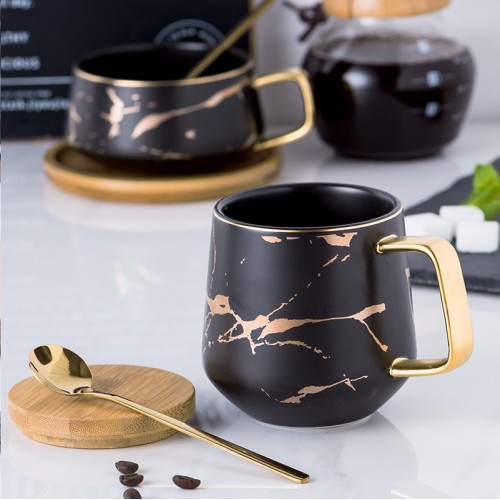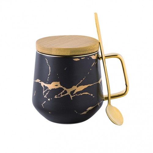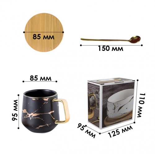 Чайная чашка A2024 з бамбуковою кришкою та ложкою золотой мрамор Black