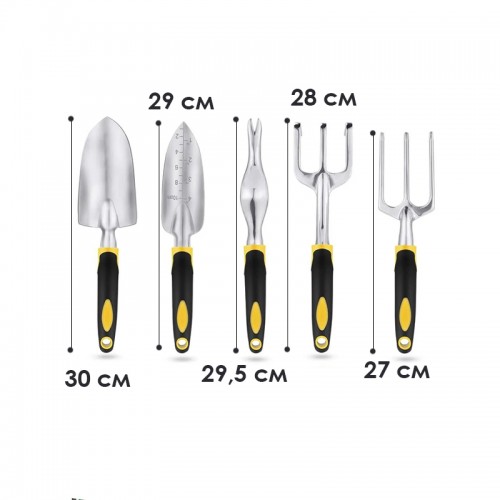 ·; Дизайн инструментов выполнен в приятных темных тонах и имеет ярко-желтые вставки, благодаря которым найти нужный Вам инструмент из комплекта среди другого садового инвентаря не составит никакого труда.