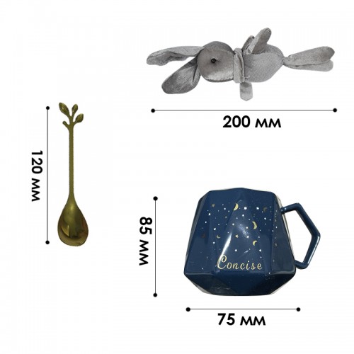 Набор включает в себя стильную чашку с глубоким синим цветом, которая поражает своей уникальной формой и стильной надписью со звездочками и луной. Это придает чашке нотки магии и загадочности. К набору прилагается золотая ложка, которая выглядит очень элегантно благодаря своей изящной форме с растительным орнаментом. Игрушка в виде мягкого зайца из серой ткани станет приятным дополнением к подарку и доставит радость получателю. Открытка с нежным дизайном и возможностью написать собственное пожелание делает этот набор еще более персонализированным и теплым.