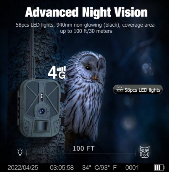 Нічне бачення забезпечується за допомогою 56 інфрачервоних світлодіодів із довгою хвилі 940 нанометрів – цей діапазон не бачимо для людського ока, тому камеру не буде видно у темряві. Дальність нічного бачення становить 25 метрів і це більше, ніж у переважної більшості фотопасток.