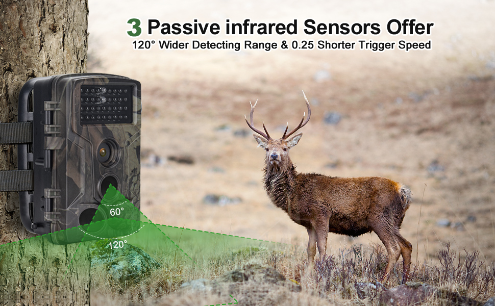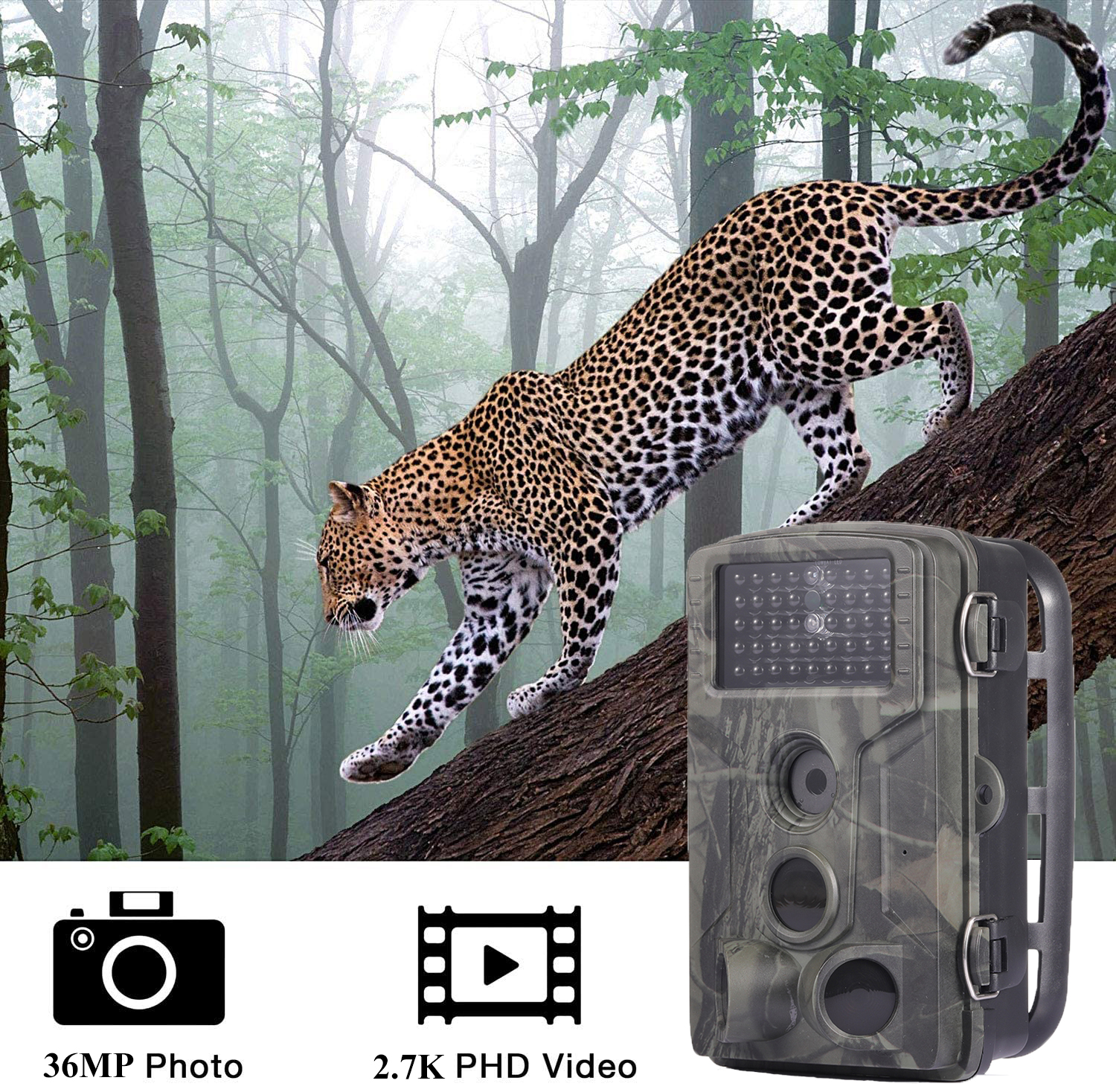 Фотопастка оснащена 5.0-мегапіксельним CMOS-сенсором та забезпечує широкий кут огляду 90 градусів з автоматичним ІЧ-фільтром. Вона має 3 PIR із кутом огляду 120°. Якість зображень варіюється від 1 до 36 мегапікселів, а відео може записуватися з роздільною здатністю від VGA до 2.7K. Ця фотопастка підтримує карти пам'яті Micro SD до 256 ГБ, а також оснащена 32 світлодіодами з дальністю підсвічування до 20 метрів.