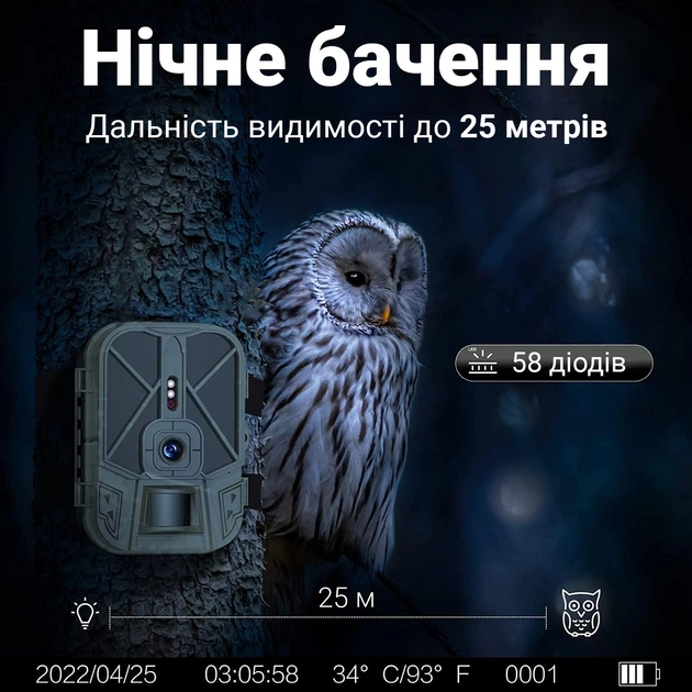 Корпус пристрою герметичний та стійкий до будь-яких погодних умов, забезпечуючи надійну роботу навіть у дощ чи сніг. Рекомендується встановлювати ловушку у вузьких місцях або на стібках, де вона буде не замішана, активуючись під час руху об'єкта спостереження та забезпечуючи вам важливі знімки або відео.