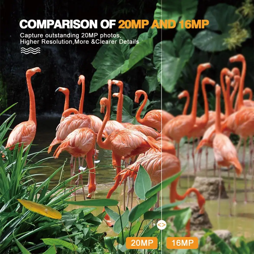 HD камери сліду з нічним баченням захоплює 1080P Full HD відео з чистим звуком та 20MP чіткі кольорові зображення вдень та чорно-білі зображення у нічний час (до 3 знімків за виявлення). Ідеальна камера для зовнішнього спостереження дикої природи.