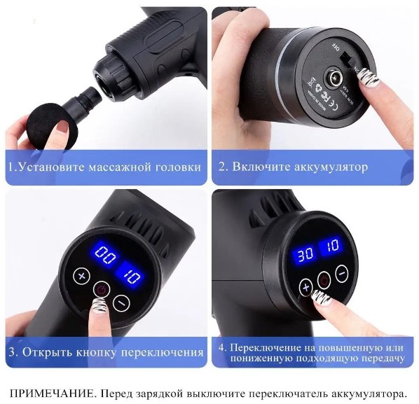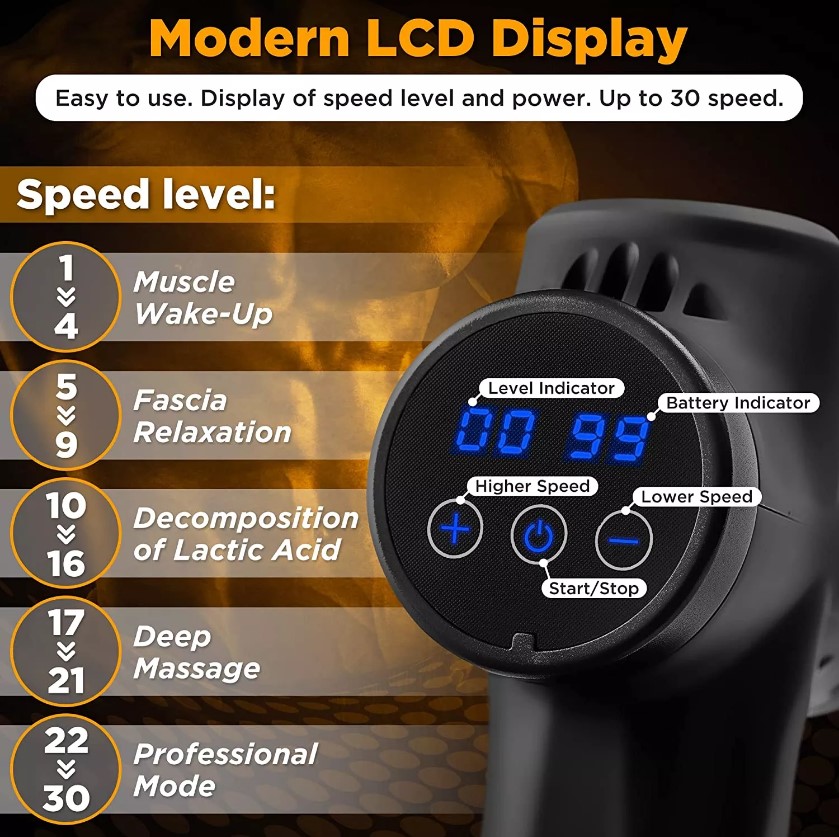 30 РІВНІЙ ШВИДКОСТІ . Виберіть оптимальну швидкість, яка краще відповідає вашим потребам і має максимальний ефект при масажі різних частин тіла та груп м'язів. При швидкості до 3600 ударів на хвилину ви можете отримати результат, який можна порівняти з професійним масажем.