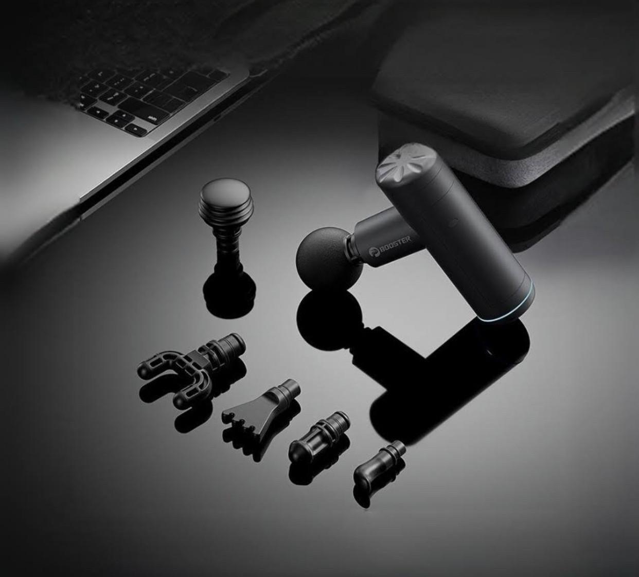 Масажер Booster DM оснащений 6 професійними масажними головками для різних типів масажу, зарядним пристроєм, компактним кейсом для зберігання, двома коробками для транспортування та інструкцією користувача.