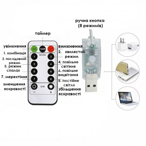 Источник питания: USB-подключение позволяет питать гирлянду от павербанка, ноутбука или адаптера к розетке.