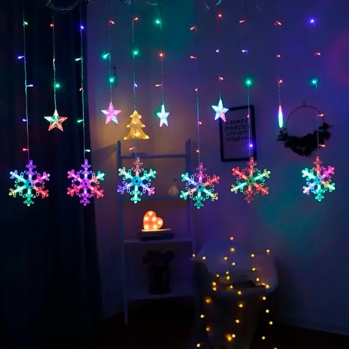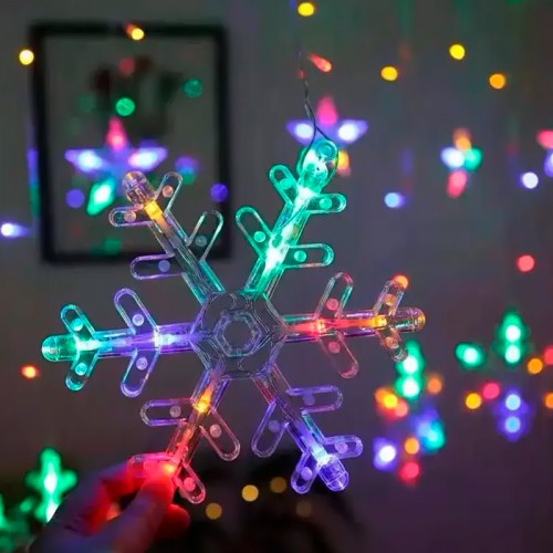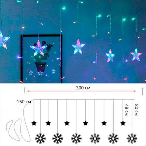 Новогодняя светодиодная гирлянда штора 3*1 метр Снежинка и звезда Цветной свет